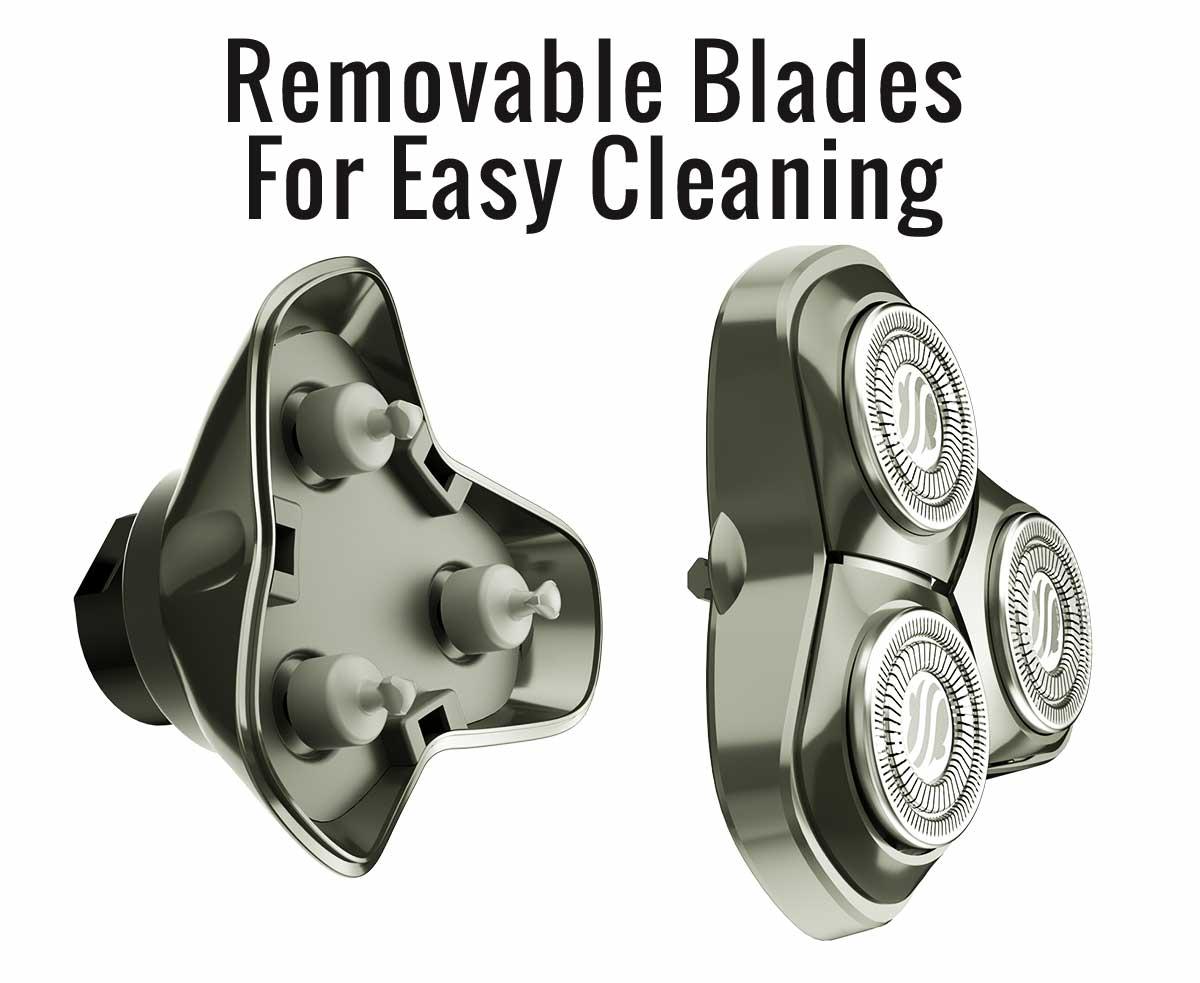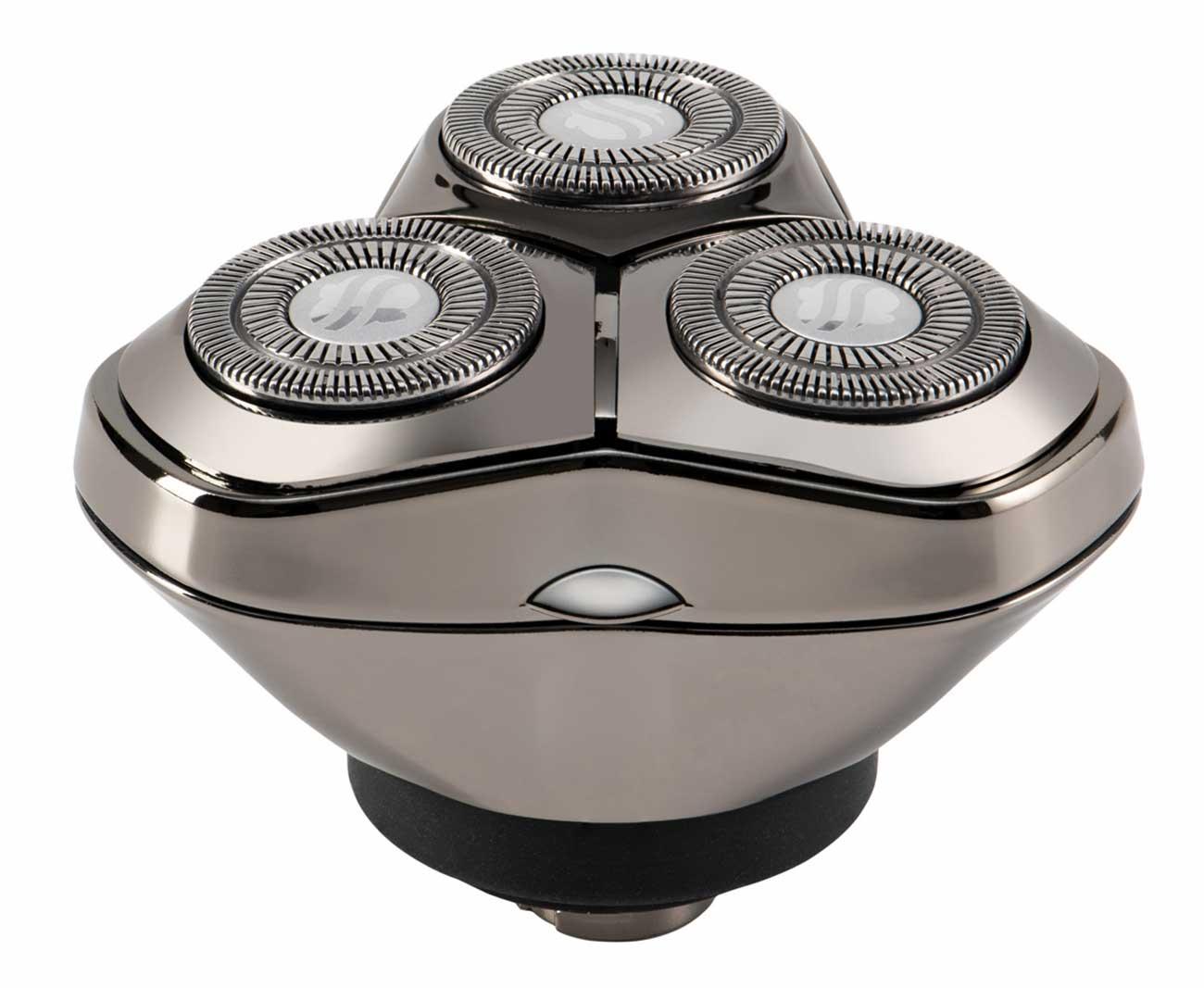 Our Palm shaver is equipped with a CR-3 Blade designed with 3 unique large flexing and pivoting heads that ensure efficient close shaving for all types of skin. Each of the three rotary heads of the CR-3 Blade flexes independently allowing a close and precise cut in all areas of head and face.